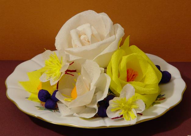 1.) iz belega, rdečega, rozastega krep papirja narežemo 5,5 x 50 cm dolg trak. Trak prepognemo tako, da dobimo 8 - 10 delov.Iz tako dobljenih delov izrežemo cvetne liste. Zgornji del cvetnega lista s pomočjo tankega svinčnika ali palice za ražnjič upognemo nazaj. Sredino cvetnega lista pa potegnemo s palcem, da se ta izboči. |